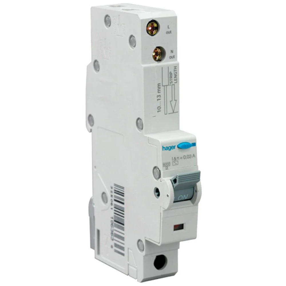 Hager ADA Electronic Residual Current Circuit Breaker with Overcurrent Protection (RCBO) provides MCB overload protection and RCD earth leakage protection (protects against electrical shocks by direct or indirect contact). This is ideal residential, commercial and industrial applications. This RCDO is designed for din rail mounting in Hager domestic consumer units and 3 phase fuseboards. It is commonly used in light commercial environments such as offices with large fluorescent or LED lighting circuits.