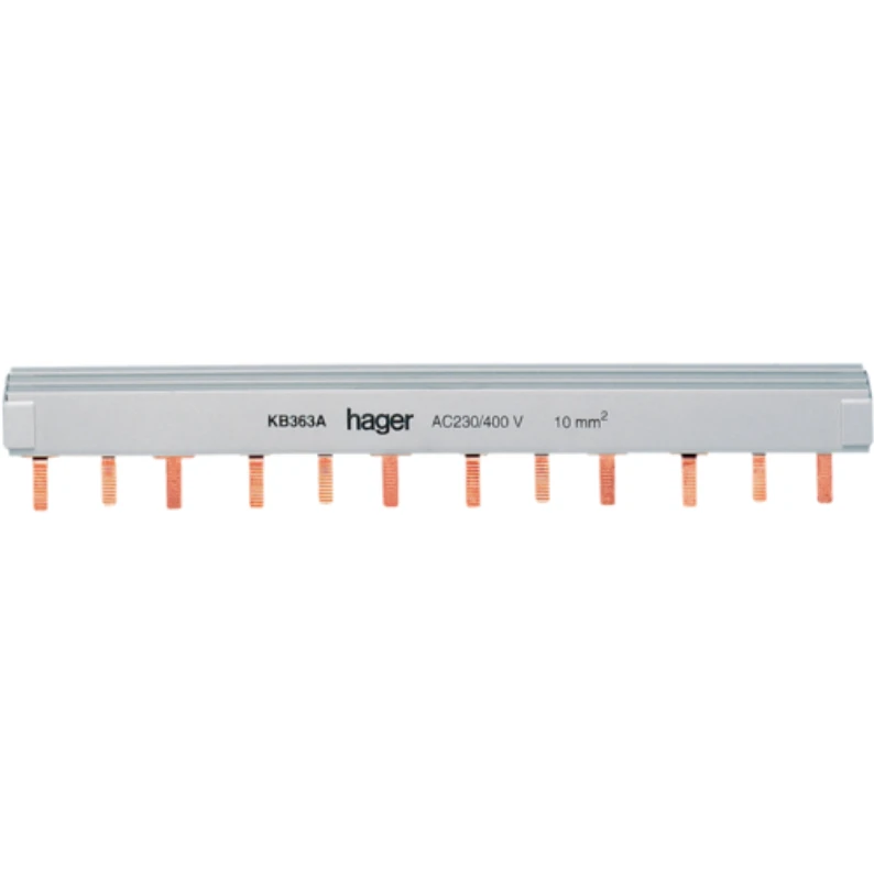 Hager Insulated Busbar for use with connecting MCBs, Modular Control Devices within Enclosures. · · · 12 Module Busbar · · 10mm Prong · · Three Pole · · Max operating voltage 230/400V · · Rated current 63 Amp