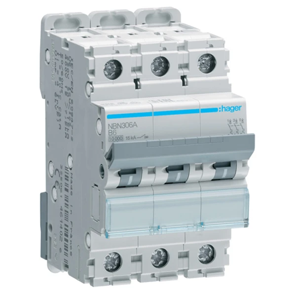 Hager NBN Din Rail Miniature Circuit Breaker has a rated short circuit capacity of 10/15kA and type-B trip curve characteristics. Hager Din Rail Miniature Circuit Breaker (MCB) is intended for use within residential, commercial and industrial premises. This offers new features, better connection, superior performance and increased levels of security. It is equipped with a strong terminal design which gives a better grip on the cable. The unique design of the terminal compensates and corrects for any distortion or possible loss in terminal torque. This true Hager innovation prolongs the use and effectiveness of the installation. The MCB can be locked in the OFF position via the integrated locking facility within the toggle. This also facilitates the use of warning tags to provide a safer working environment for all personnel. · · · B-Curve characteristic · · Triple Pole · · 3-Modules · · 83 x 70mm size