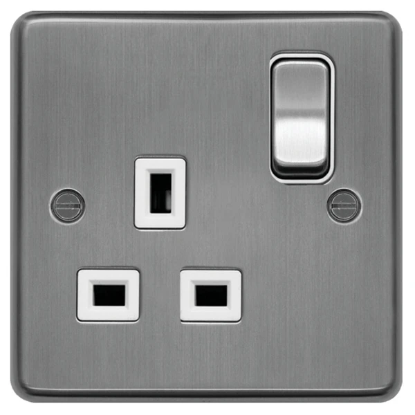 Hager Socket 1 Gang DP Switched 13A Brushed Steel White Insert