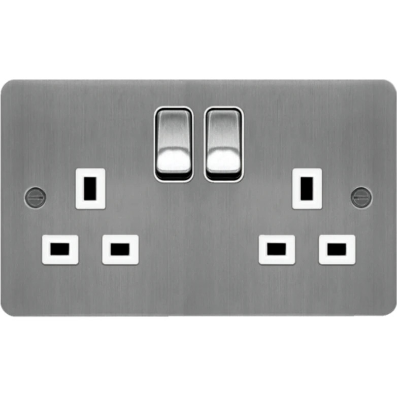 Hager – Wiring Accessories WFSS82BSW Sollysta Socket 2 Gang DP Switched Dual Earth 13A Brushed Steel c/w White Insert · · · Product: Socket Outlet · · Switched/Unswitched: Switched · · Gangs: 2 Gang · · Pole Configuration: Double Pole · · Insert Colour: White · · Length Min Max: 86 mm · · Height: 86 mm · · Width: 48.5 mm · · Standards: BS 1363