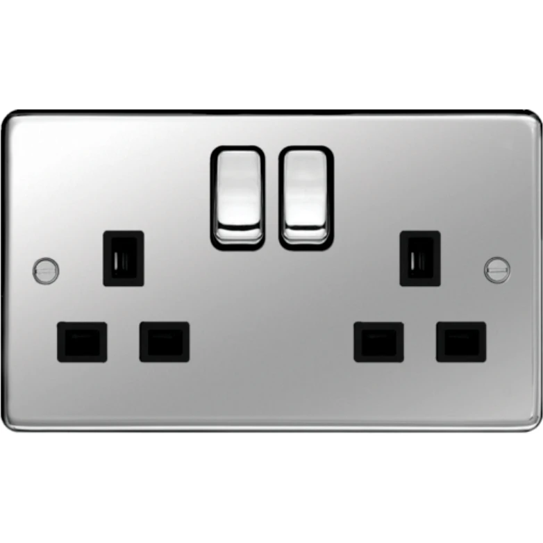 13A 2 Gang Double Pole Switched Socket Polished Steel Black Insert