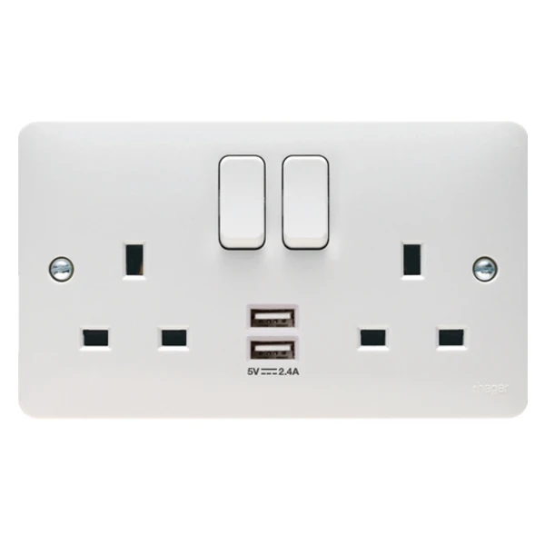 Hager Sollysta WMSS82USB Switched Socket with Twin Earth 2-Gang 2-Pole 13A 240VAC 2xUSB White