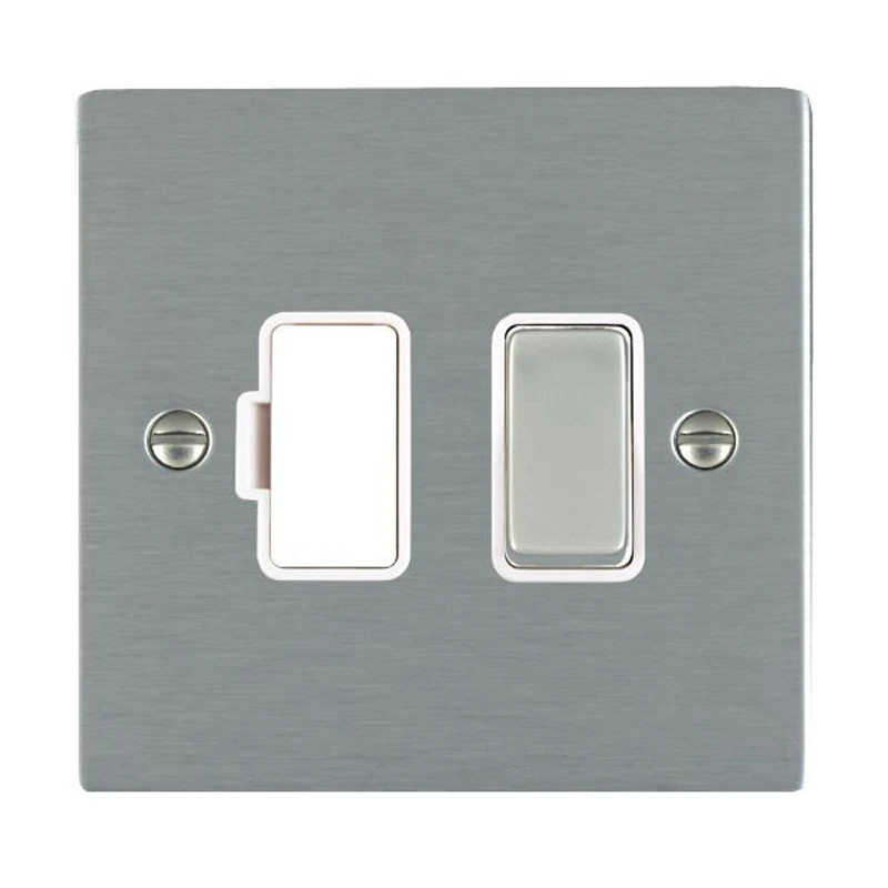 Hamilton Sheer Fused Connection Unit with satin stainless finish, meld seamlessly into modern interiors. Sheer’s minimalist flat plate switches and sockets meld seamlessly into modern interiors. This modern and elegant range is available in nine fantastic finishes and by mixing box fix with grid and concealed fixing in this range, allows it to be very flexible for different areas of a project and costs can be minimised without losing continuity of design. Must be earthed. Internal Use Only. · · · Single – Nominal Dimensions H: 86.0mm W: 86.0mm D: 1.5mm – Box Fixing Hole Centers: 60.3mm · · Generic Size: Single · · Switched Poles: Double · · Current Rating: 13 Amp · · Voltage: 220/250V AC · · Maximum Load 13 Amp · · Mains Frequency: 50Hz · · IP Rating: IP2XD · · Standard/Approval: BS 1363-4 · · Insert Finish/Surround Colour: Satin Steel/White – Plate Finish: Satin Steel