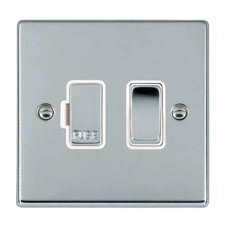 Hamilton Hartland Fused Connection Unit with bright chrome finish. A range of sleek and stylish accessories with slim front plates to complement today’s interiors. This attractive range is available in nine elegant finishes with complementary switch insert finishes. Must be earthed. Internal Use Only. · · · Single – Nominal Dimensions H: 88.0mm W: 88.0mm D: 5.0mm – Box Fixing Hole Centers: 60.3mm · · Generic Size: Single · · Switched Poles: Double · · Current Rating: 13 Amp · · Voltage: 220/250V AC · · Maximum Load 13 Amp · · Mains Frequency: 50Hz · · IP Rating: IP2XD · · Standard/Approval: BS 1363-4 · · Insert Finish/Surround Colour: Bright Chrome/White – Plate Finish: Bright Chrome
