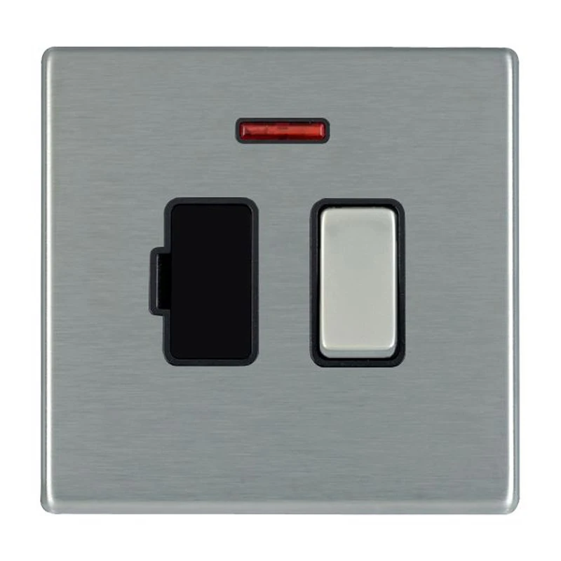 Hamilton Hartland CFX Fused Connection Unit with neon is available in stainless steel finish. Slim and stylish with soft rounded edges, the Hartland CFX range helps provide the finishing touch to any project. The face plate is firmly held in place to the back frame with a patented 4 point clipping system, concealing the fixings for a seamless finish. Must be earthed. Internal Use Only. · · · Single – Nominal Dimensions H: 86.0mm W: 86.0mm D: 5.0mm – Box Fixing Hole Centers: 60.3mm · · Generic Size: Single · · Switched Poles: Double · · Current Rating: 13 Amp · · Voltage: 220/250V AC · · Maximum Load 13 Amp · · Mains Frequency: 50Hz · · IP Rating: IP2XD · · Standard/Approval: BS 1363-4 · · Insert Finish/Surround Colour: Satin Steel/Black – Plate Finish: Satin Steel Effect