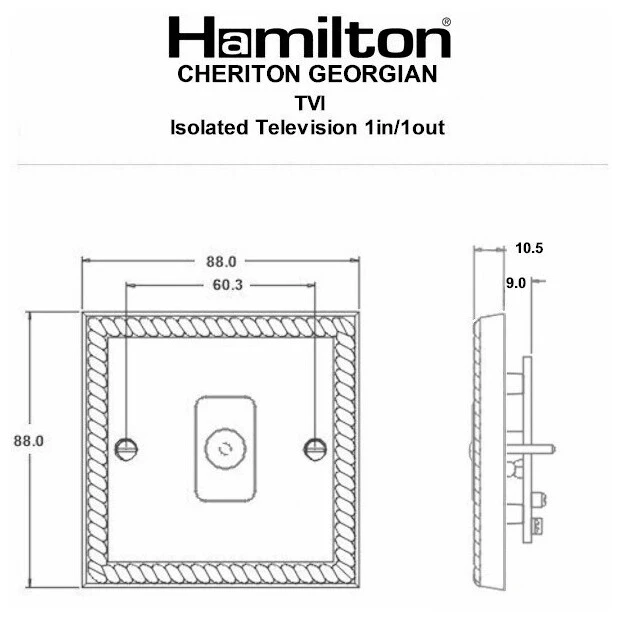 Must be earthed (ref BS7671 415.2.1). Internal Use Only. · · · Single – Nominal Dimensions H: 88.0mm W: 88.0mm D: 10.5mm – Box Fixing Hole Centers: 60.3mm · · Generic Size: Single · · IP Rating: IP2XD · · Standard/Approval: BS 5733 · · Insert Colour: White · · Plate Finish: Polished Brass