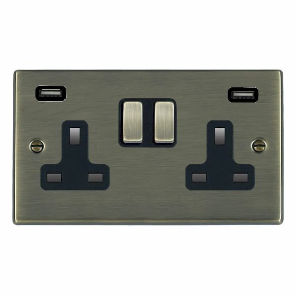 Hamilton Socket 2 Gang Single Pole Switched USBs 13A 85 x 145mm Antique Brass/Black