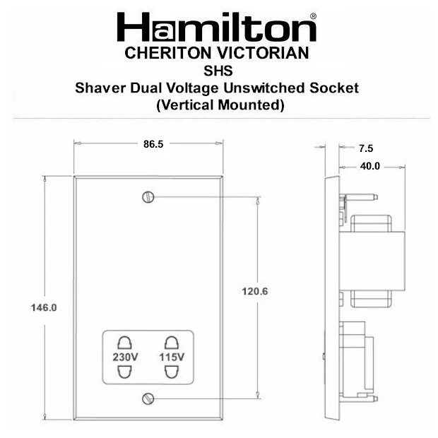 Must be earthed. Internal Use Only. Must be mounted vertically. Shuttered :Yes. Box Depth 47mm. · · · Double – Nominal Dimensions H: 146.0mm W: 86.5mm D: 7.5mm – Box Fixing Hole Centers: 120.6mm · · Generic Size: Double · · Switched Poles: None · · Current Rating: 20VA · · Voltage: 220/250V AC · · Maximum Load 200/250V input; 115/230V 20VA output · · Mains Frequency: 50Hz · · IP Rating: IP2XD · · Standard/Approval: BS EN 61558-2-5 + BS 4573 · · Insert Colour: White – Plate Finish: Polished Brass