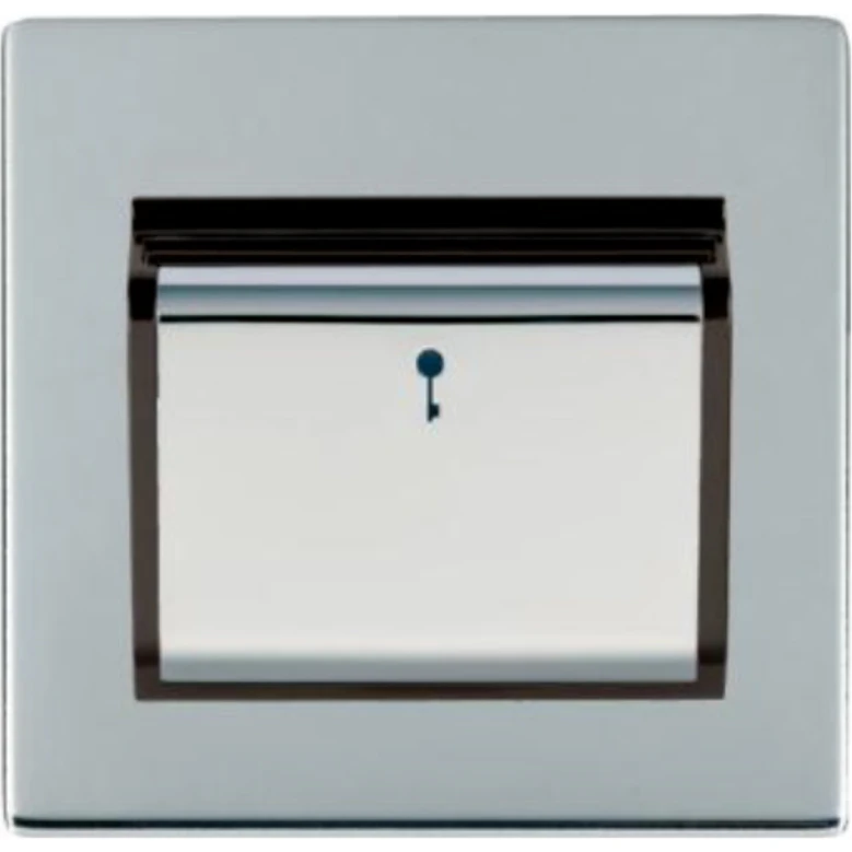 Must be earthed. Internal Use Only. Adjustable Time Delay 10 seconds – 5 minutes. Suitable for 44mm and 54mm width Hotel Key Cards. · · · Single – Nominal Dimensions H: 86.0mm W: 86.0mm D: 1.5mm plate + 3.0mm gasket – Box Fixing Hole Centers: 60.3mm · · Generic Size: Single · · Switched Poles: Single · · Current Rating: 10A (6AX) · · Voltage: 220/250V AC · · Maximum Load 10 Amp (6 Amp inductive) · · Mains Frequency: 50Hz · · IP Rating: IP2XD · · Standard/Approval: BS EN 60669-2-3 · · Insert Finish/Surround Colour: Bright Chrome/Black – Plate Finish: Bright Chrome