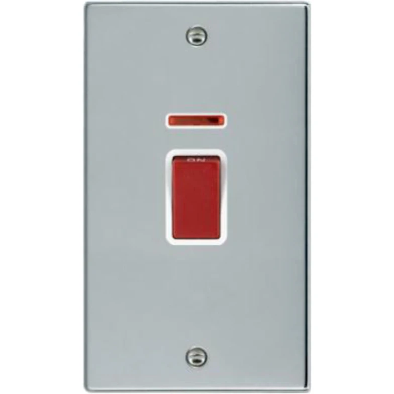 Hamilton Litestat 7745VW Hartland Switch Rocker Red 1 Gang DP+Neon 45A 85x145mm Bright Chrome Whi Insert Must be earthed. Internal Use Only. Must be mounted vertically. · · · Double – Nominal Dimensions H: 144.5mm W: 88.0mm D: 5.0mm – Box Fixing Hole Centers: 120.6mm · · Generic Size: Double · · Switched Poles: Double · · Current Rating: 45 Amp · · Voltage: 220/250V AC · · Maximum Load 45 Amp · · Mains Frequency: 50Hz · · IP Rating: IP2XD · · Standard/Approval: BS EN 60669-1 · · Insert Finish/Surround Colour: Red/White – Plate Finish: Bright Chrome