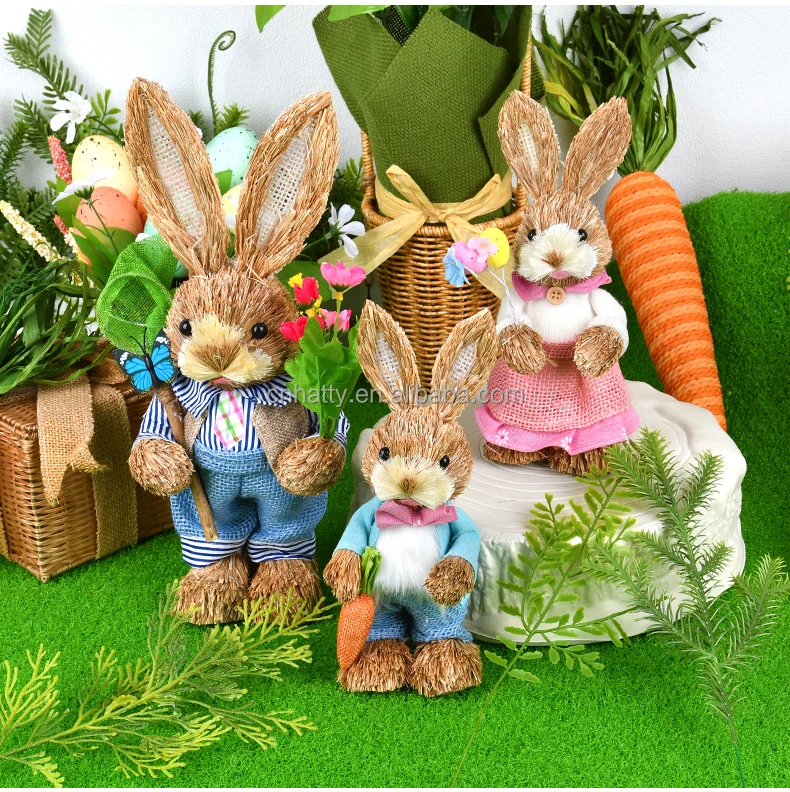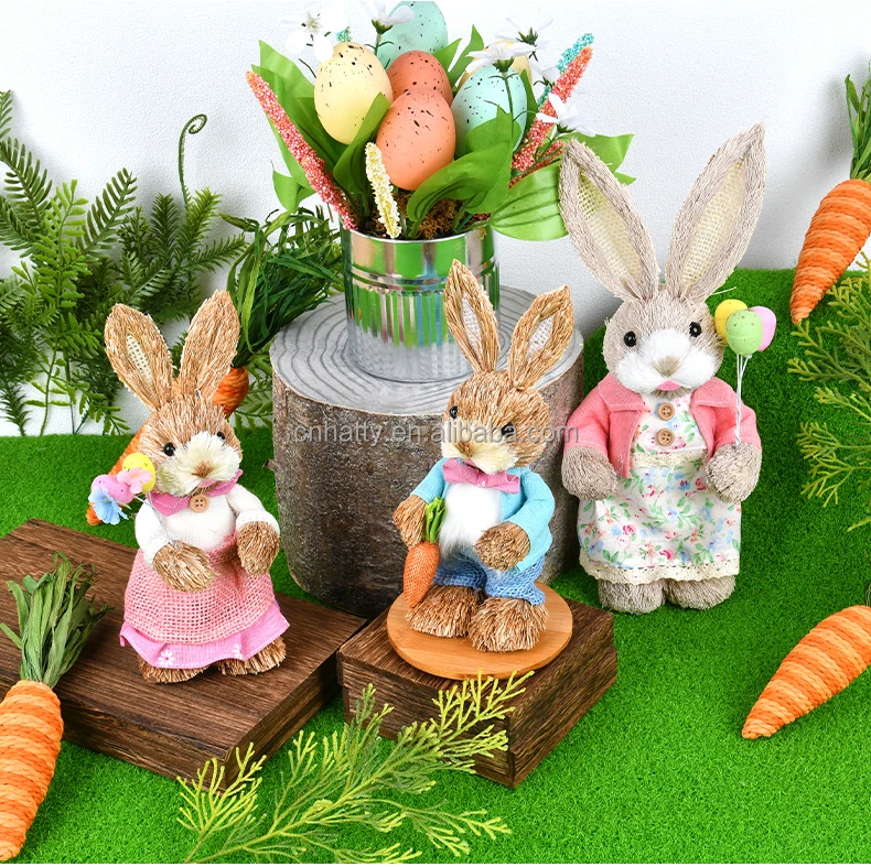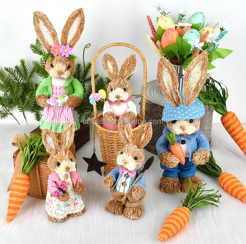Hand-Woven Easter Straw Rabbit Cattail Ornaments Creative Spring Dress Window Decorations Beauty Props Bunny Egg 2pcs MOQ Pack of 2