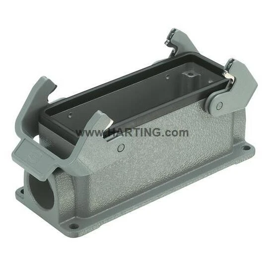 19300241231 Surface mounted housing, Size: 24 B, Low construction, Double locking lever, Polycarbonate (PC), Stainless steel, Side entry, 1x M25, Material (hood/housing): Aluminium die-cast, Powder-coated, RAL 7037 (dust grey), Material (seal): NBR, Degree of protection: IP65 · · · Locking type: Double locking lever · · 1x M25 cable gland · · Size: 24B · · Han-Easy Lock included · · NBR seal · · Limiting temperature -40 to 125C · · IP65 degree of protection · · RoHS compliant · · Low construction type · · Flammability acc. to UL 94: V-0