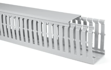 Halogen-free wiring ducts · · · Excellent fire-safety characteristics according to UL94 und EN 45545-4 · · Narrow slots suitable for small-diameter wires · · Smooth, burr-free edges protect installers from injury and wires from damage · · Fingers can be removed with no sharp edges at pre-notched snap-off points · · Further pre-notched snap-off point at base of sidewall allow cutting out and removing sections of sidewall with no sharp edges · · Duct covers hold securely even in a vertical position and under vibration · · Cover is flush with side of duct, allowing for tight, contiguous placement of duct · · Base perforation according to DIN EN 50087