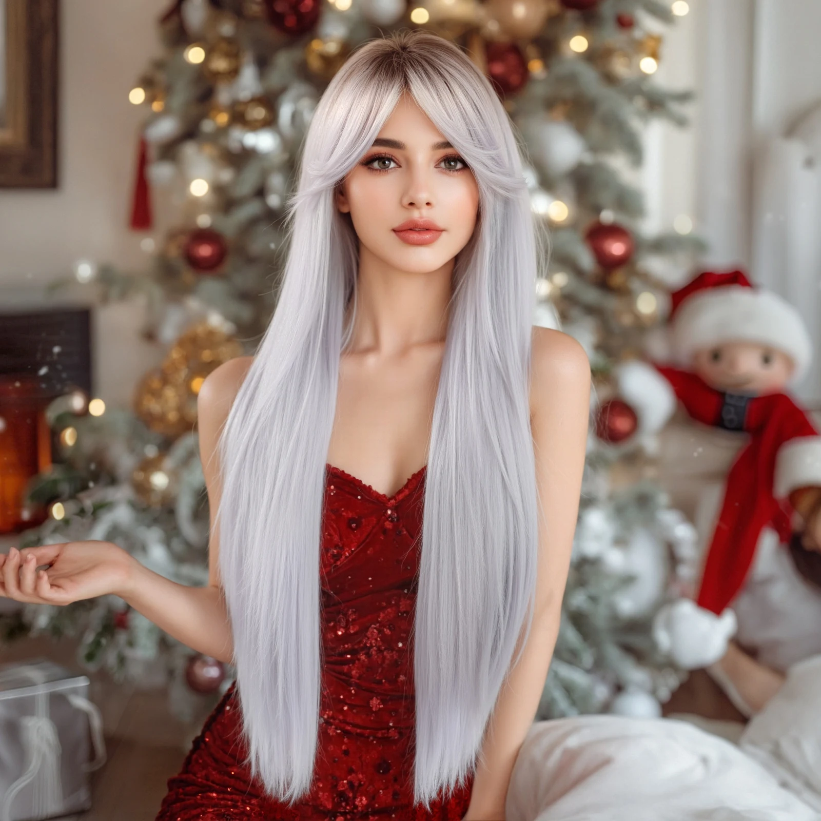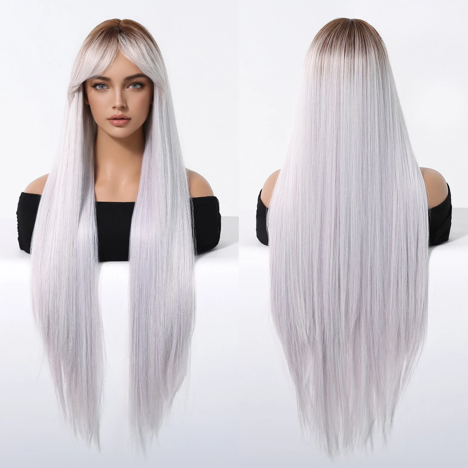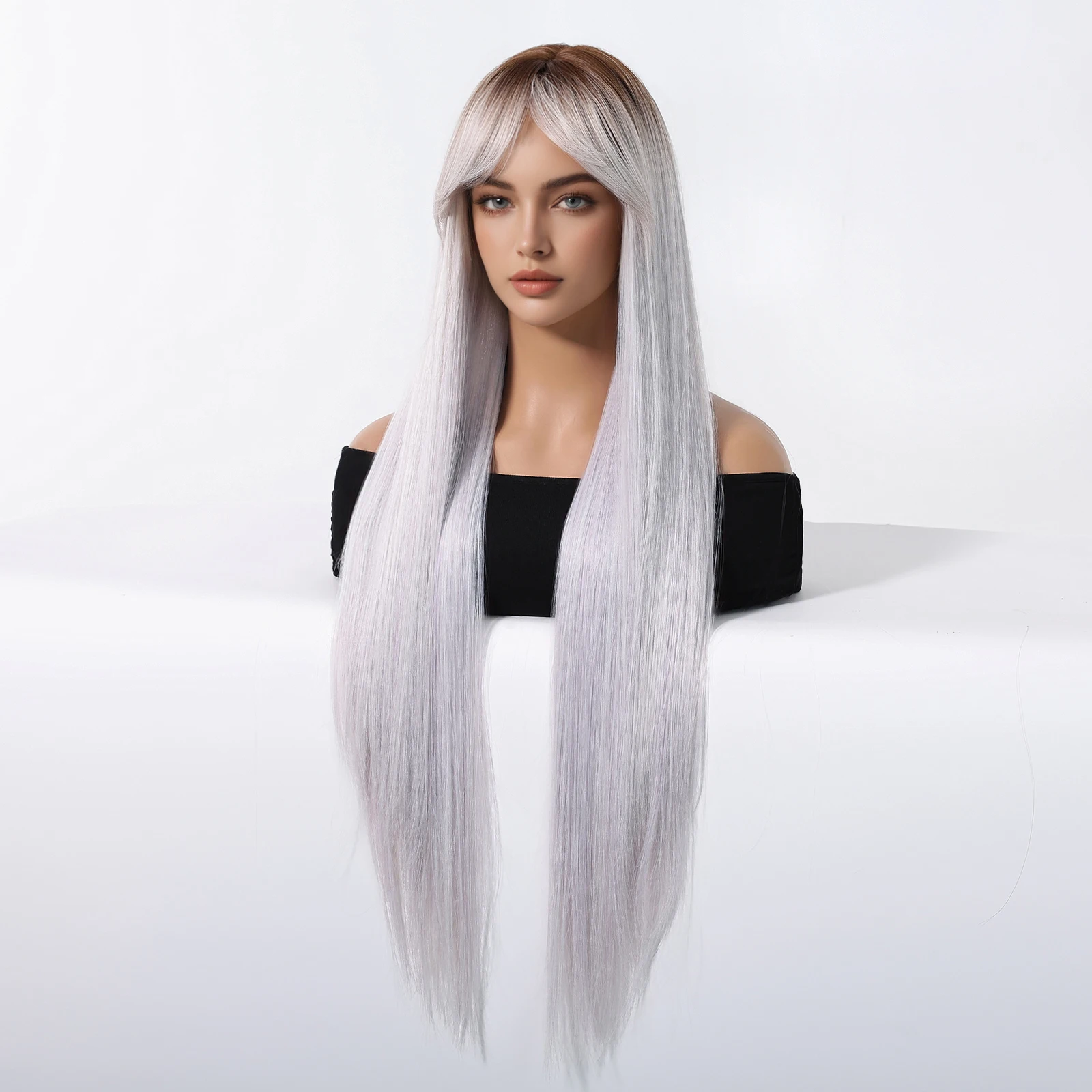 High Fiber Synthetic Matte Wig Long Straight Dark Root Ombre Silver Wig with Bangs Elastic Rose Net Cap Real Shot 30inch