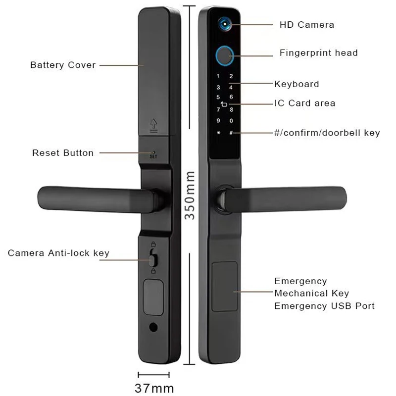 1. Advanced 5-in-1 Keyless Entry Smart Door Lock:Smartphone TUYA WIFI+Fingerprint +Code +Card +Key; 2. Press the “#”(doorbell) on the lock and the model will send the image to the app. You can see who is visiting and unlock remotely;3. Customized voice for 8 countries, English/Arabic/Russian/Portuguese/Thai/Spanish/Vietnamese/Indonesian; 4. Tempered glass + aluminum alloy material has high hardness, good durability; 5. Suitable for left/right door, easy to change handle direction; 6. Power Supply: 4pcs AA Alkaline batteries; 7. Temporary password function, share one-time password to your friends and family anytime and anywhere. 8.Convenient APP management system, you can manage your smart lock anytime and anywhere;9. Emergency Power Supply:with micro USB interface to supply power if the batteries run out; 10. Fingerprint recognition:Semiconductor fingerprint recognition module, suitable for elderly and child; 11.Super narrow frame size: 350*37*58MM, suitable for many kinds of door installation. Small but not simple. Suitable for many kinds of lock body with holes. Supported locking system series: 50 mortise,85 mortise,72 mortise 12.Support ODM/OEM; Custom panel logo,color box, IC card,user manual. Product Description Product Name 37MM wide bezel smart door lock Material Made of aluminum alloy material Brand HuangJia Colour Silver 、 black weight 2KG Place of Product Guangdong Province,China Unlock method Fingerprint, password, swipe card, key, tuya wifi APP Modes of packing Packed in a colored carton, Size Length: 350 Width: 37 Height: 58 After sale service twoyear warranty power supply 4 AA batteries Applicable scene Aluminum alloy door/sliding door/narrow frame door/framed glass door Generation Second generation DIY design Simple to use, simple to install Experience Simple, fine workmanship,durable Security Level C-level lock cylinder Detailed Images Packing&Shipping