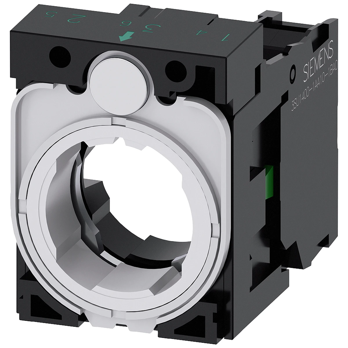 Siemens empty holder for up to 3 modules made up of a plastic housing. This unit has 1 NO auxiliary silver alloy contact. · · · Screw type terminals: 0.5-1.5mm² · · 6A Operating current (at 230V rated value) · · Insulation voltage rated 500V · · Front plate mounting · · Without positive opening · · Mechanical sevice life: 10 cycles · · IP20 Degree of protection · · Vibration resistance: 5g (10-500Hz) · · Shock resistance: 50g · · Ambient temperature: -25 to 70°C