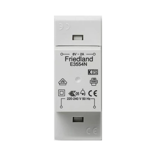 Friedland Classic Transformer is used to suit every bell or chime installation requirement. It is easy to install and is backed up with a two years guarantee. It has fail-safe design, once a short circuit occurs it cannot be reset and reused. · · · Easy to install · · Used for fixed installations · · For use with door chimes and bells · · For DIN/surface mounting · · Meets KEMA and VDE certification and conforms IEC 61558-2-8 standards