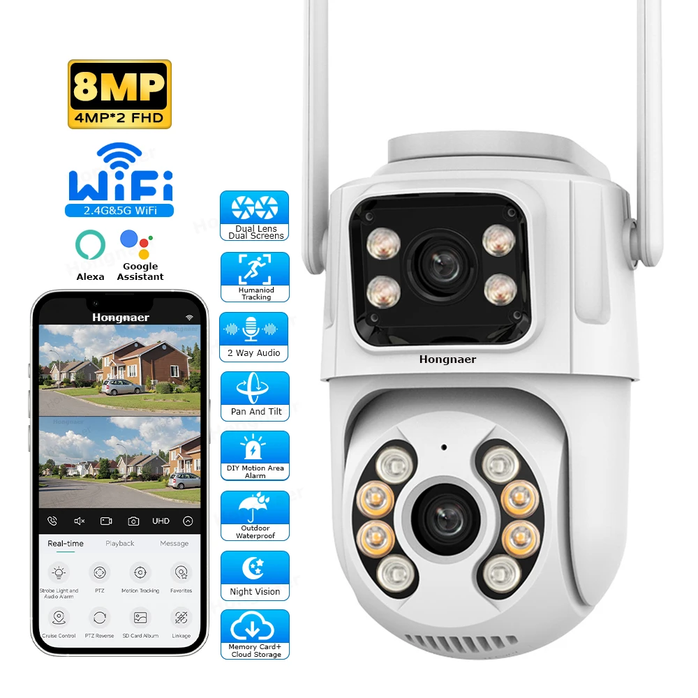 Hongnaer 8MP HD Smart Outdoor Home Wireless IP PTZ Camera ICSee 4K Dual Lens 360 2.4G 5G WiFi Video CCTV Network Security Camera