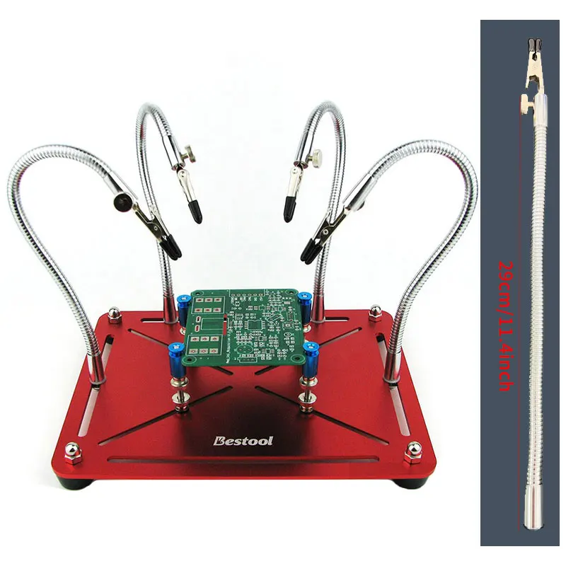 Product Images Customer Reviews & Pictures Product Specifications Flexible Arm Quantity 4 Pcs metalFlexible Arm Material metal Flexible Arm Length 29cm/0.95ft Base Material Stainless steel PCB Holder Size 230X185mm/9X7.3inch Selling Points 3. 4 pcs 24cm Length Flexible Metal Heat-resistant Arms Can Precision Stay where you want them, but fluid enough to move into that perfect position that you just cannot obtain with another “helper”, better than the plastic ball and socket joints type arms which may melt with the heat of a soldering iron 4. 4 pcs stainless steel alligator clamps are mounted onto the end of the arms with screw mounted which can be rotated 360 dgrees in either direction then locked into place.The clips has the heat resistant silicone case to protect your projects from scars or electrical shorts and can be used delicate objects Recommended by seller Strong Magnetic Suction Spring Clamp Holder Tool for Circuit Board Electronic Repair Tool for Large Size PCB Soldering Repair.