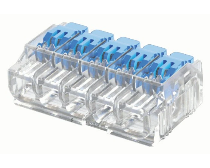 The Gen II 5 Port Lever Connector is a reusable wire connector that is designed to make electrical connections quickly and easily. It is compatible with solid, stranded, and flexible wires up to 4mm² (12AWG) and 32 Amps. The connector has a clear shell that allows for verification of the connection, and a continuity check port for testing. The levers open in the opposite direction of the insertion point, which helps to prevent accidental loosening or pull out. The connector is also compact and easy to use, making it a great choice for a variety of electrical applications. · · · Resealable Connector For Solid Stranded And Flexible Wires · · Innovate Levers That Open In The Opposite Direction Of Insertion Points · · Continuity Check Port For Testing · · Clear Shell Allows For Verification Of Connection · · Innovate Levers That Open In The Opposite Direction Of Insertion Points · · Continuity Check Port For Testing · · Clear Shell Allows For Verification Of Connection · · Wire Clamping Range 0.2mm2 To 4mm2 For Solid And Stranded Wires And 0.14 mm2 To 4mm2 For Flexible Wires · · 18th Edition IEC60998 And UL486C Compliant · · CE UKCAUL And ENEC Approved