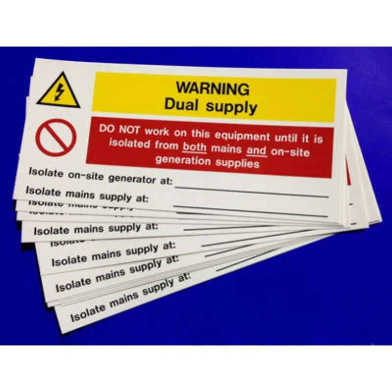 Industrial Signs IS8110SA Label Dual Supply Notice 130x60mm Yellow/Black/Red on White Vinyl Pk=10 · · · Product: Label · · Type: Warning Sign · · Extra Information: Pack of 10 · · Labelling: Warning Dual Supply · · Material: Vinyl · · Colour: Yellow/Black/Red on White · · Length Min Max: 130 mm · · Width: 60 mm