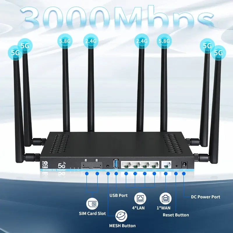Industrial MT7981B Router Dual SIM Card Slot with 5G Wifi6 AX3000 5G Sim Router Unlocked High-speed 1GB DDR4