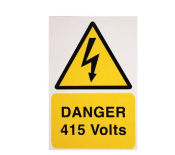 Self adhesive rigid pvc black and yellow danger 415 volts sign. · · · Size: 150 x 225mm · · Type: Self Adhesive Rigid Pvc