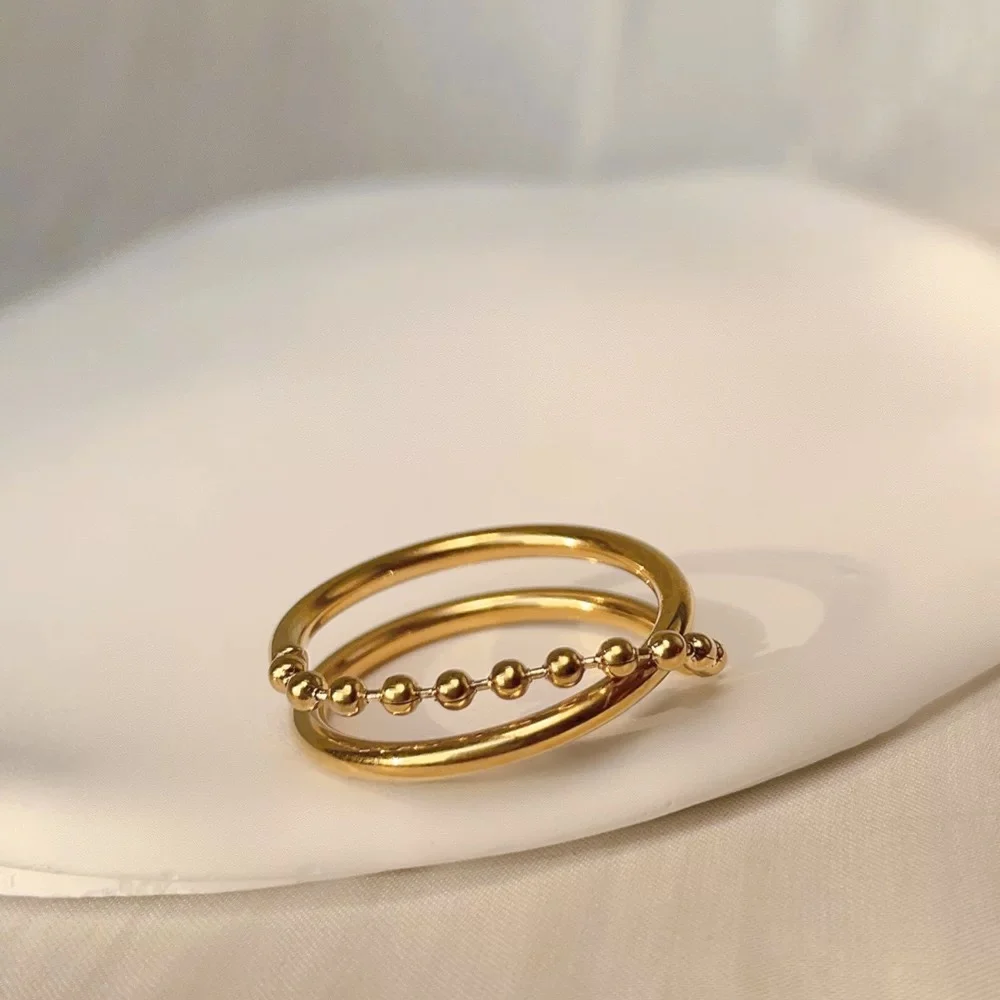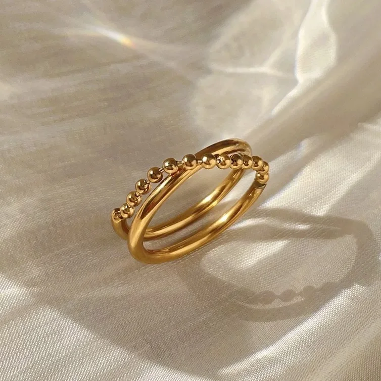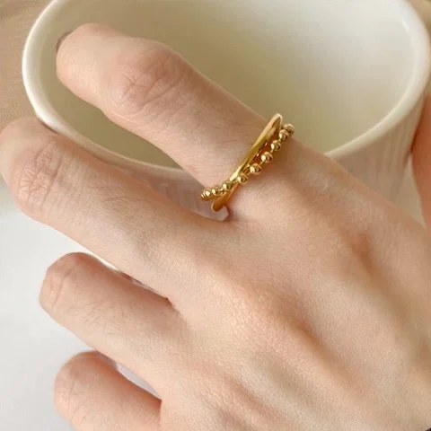Ins Style Pvd Gold Plated Double Layer Beads Cross Index Finger Ring Fashion Jewelry for Women