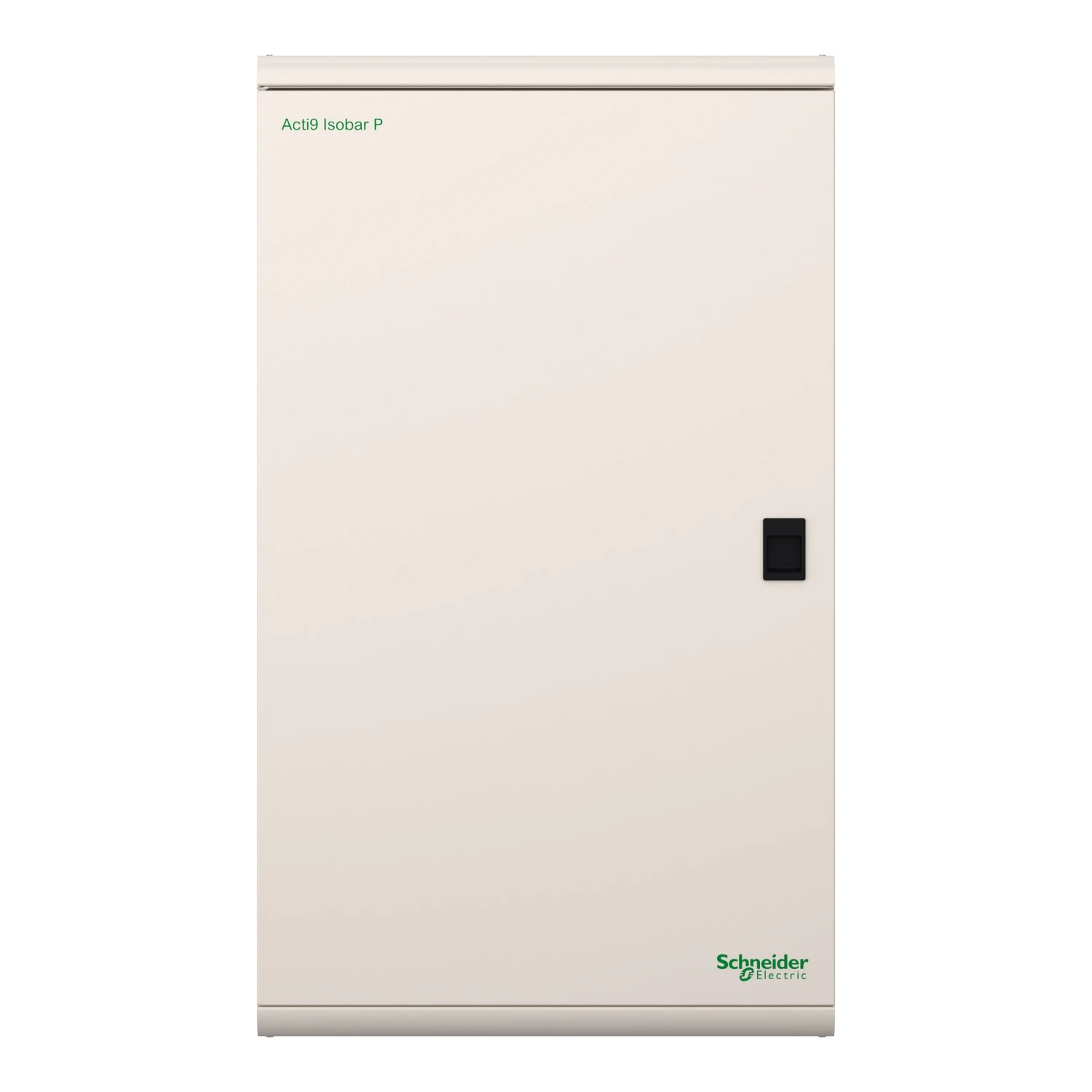Acti9 Isobar P B Standalone Active distribution board integrates Active AFDDs The rated current is up to 125A. The number of Active AFDD ways available is 24. The Ue rated operational voltage is 230/240 V AC or 400/415 V AC The provided equipements are enclosure, door, earth stud,front cover,pan assembly,earth terminal block,blanking plate and removable gland plates. The pole configuration is 3P+N. The enclosure is suitabel for surface mount. The Ui rated insulation voltage is 500V. The Uimp, rated impulse withstand voltage is 6 kV. The offer is part of Commercial building distribution catalog The dimensions are (W) 470mm x (H) 808mm x (D) 140mm. The switchboard colour is RAL9001. The degree of protection is IP3x with door closed in an enclosure. Complies with BS EN 61439-3 standard. The offer has approved UKCA marking. · · · Breaking capacity 25 kA · · Rated insulation voltage 500 V · · Rated impulse withstand voltage 6 kV · · Enclosure material Steel