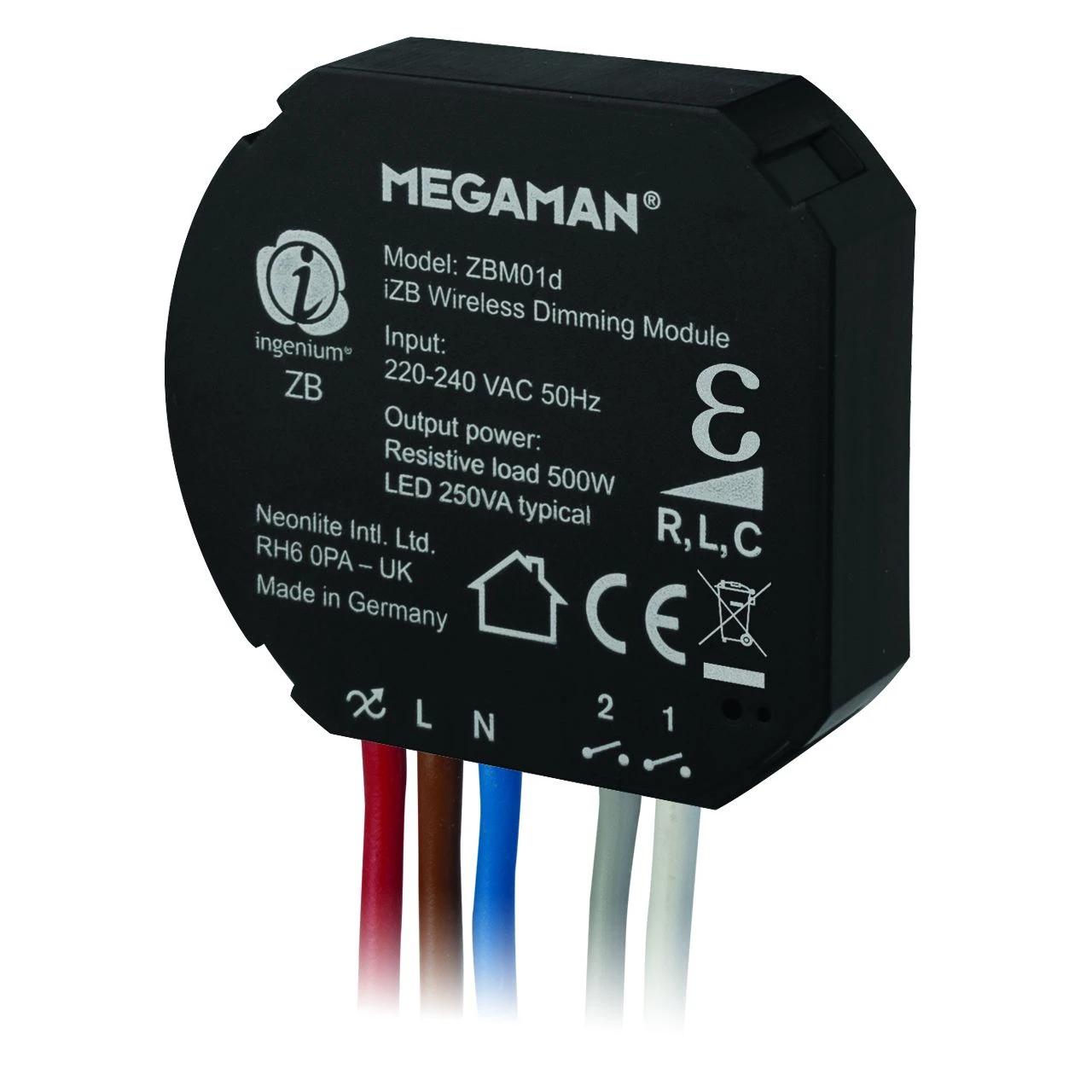 Smart iZB black universal dimming module for seamless dimming performance, the 3-wire connection smart ZB Universal Dimming module is Zigbee home automation certified and compatible with all Megaman standard dimmable products · · · Compatible with the gateway when connected to a wi-fi router for local and remote access · · Compatible with all Megaman standard dimmable products · · Can be controlled by smart devices with the ingenium ZB app · · Auto dimming mode selection fo all attached end devices · · Connects up to 250VA LED devices in total · · Connects with retractive switch if required, for flexibility between old and new technology/aesthetics · · 3 wires (live, switched live and neutral) · · Leading and trailing edge compatible