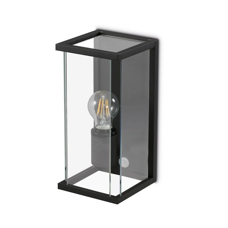 Decorative square wall lantern ES E27 15W LED max c/w PIR IP54 anthracite/black. · · · Stylish contemporary design · · Durable die-cast aluminium construction · · Toughened glass lantern with ES E27 lamp holder · · IP54 protection against dust and moisture · · PIR option available · · Suitable for use with LED lamps