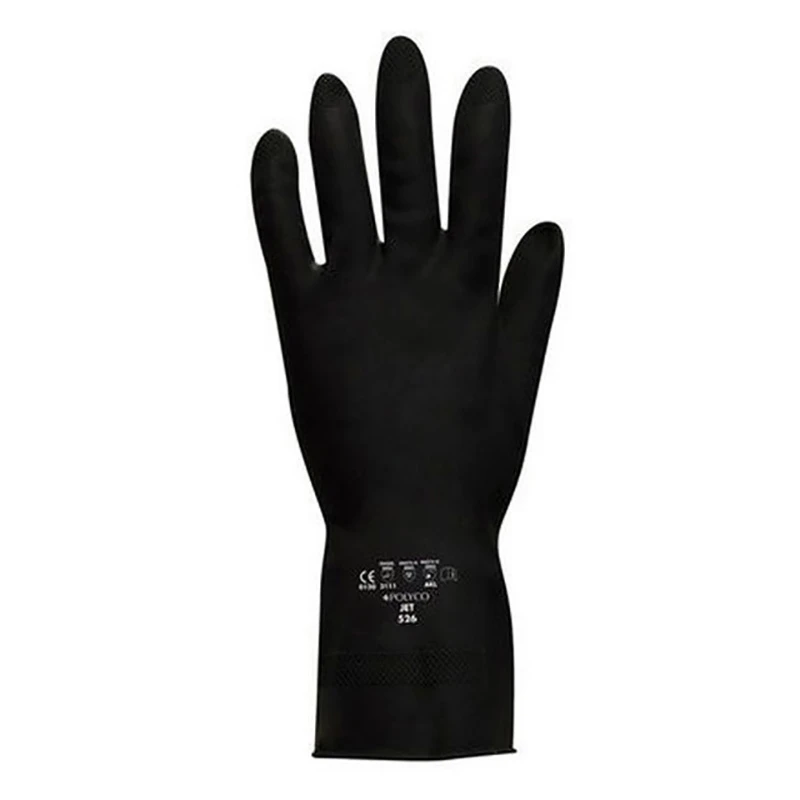 Polyco Jet is a heavy-duty natural flock-lined black rubber glove that will stand up to repeated knocks, rubbing and scuffing. · · · Performance: A heavyweight glove that will stand up to repeated knocks, rubbing and scuffing · · Chlorinated: Treated to harden the surface of the glove leaving it smooth to the touch · · Comfort: Anatomical shape ensures comfort and reduces hand fatigue · · Good Grip: Slip resistant pattern on the palm enhances grip · · Cuff: Beaded cuff to prevent liquid roll back · · Cotton Flock: Soft cotton flock lining absorbs perspiration, keeping hands cool · · Hygiene: Contains fungicidal and bacteriostatic agent · · Food Contact: Tested in accordance with European standard EN1186 making it suitable for food contact