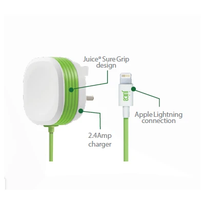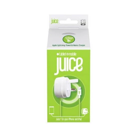 Keep any Apple device charged with the Juice Lightning Plug Charger. The lightning connector fits any iPhone, iPad or iPod and the 2.4amp charger gets the charge to full quickly. The handy carry bag keeps the charger protected. Included is a mains charger with integrated 1.5m Apple Lightning cable. This product comes in a useful bright green colour to make it easy to find and identify the charger amongst your belongings. · · · Length: 1.5m · · Includes AC Mains adaptor · · 2.4Amp · · Input: 100-240V 50/60Hz 0.35A · · Output: 5V/2.4A