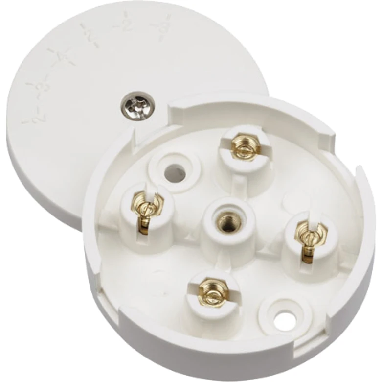 Scolmore International WA070 Essentials Junction Box 4 Terminal Selective Entry 5A White · · · 5A Junction box · · Colour: White · · Selective entry – 4 terminal · · IP20 Rated