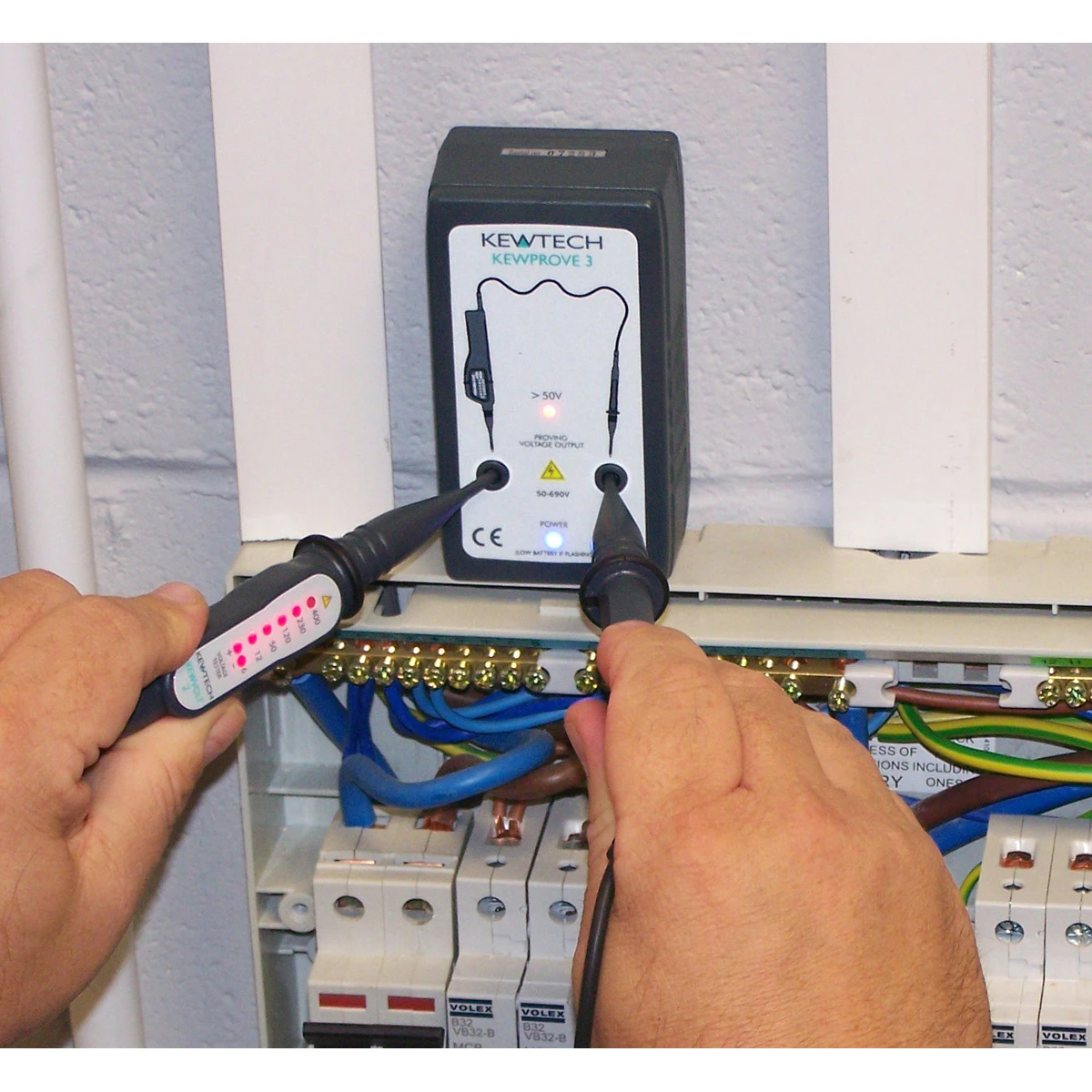 The Kewtech KEWPROVE3 is essential for proving circuits are dead before commencing work. The high output will drive low impedance testers such as traditional test lamps as well as modern two pole testers. The one to have to be confident that it will work with your tester. It even steps down through the voltage stages to prove each stage as well. It includes batteries, instruction manual and certificate of conformity. KEWPROVE3 proving unit with up to 690V AC/DC output then steps down to 50V proving each level. · · · An essential part of safe isolation kit · · Works with any 2 pole tester
