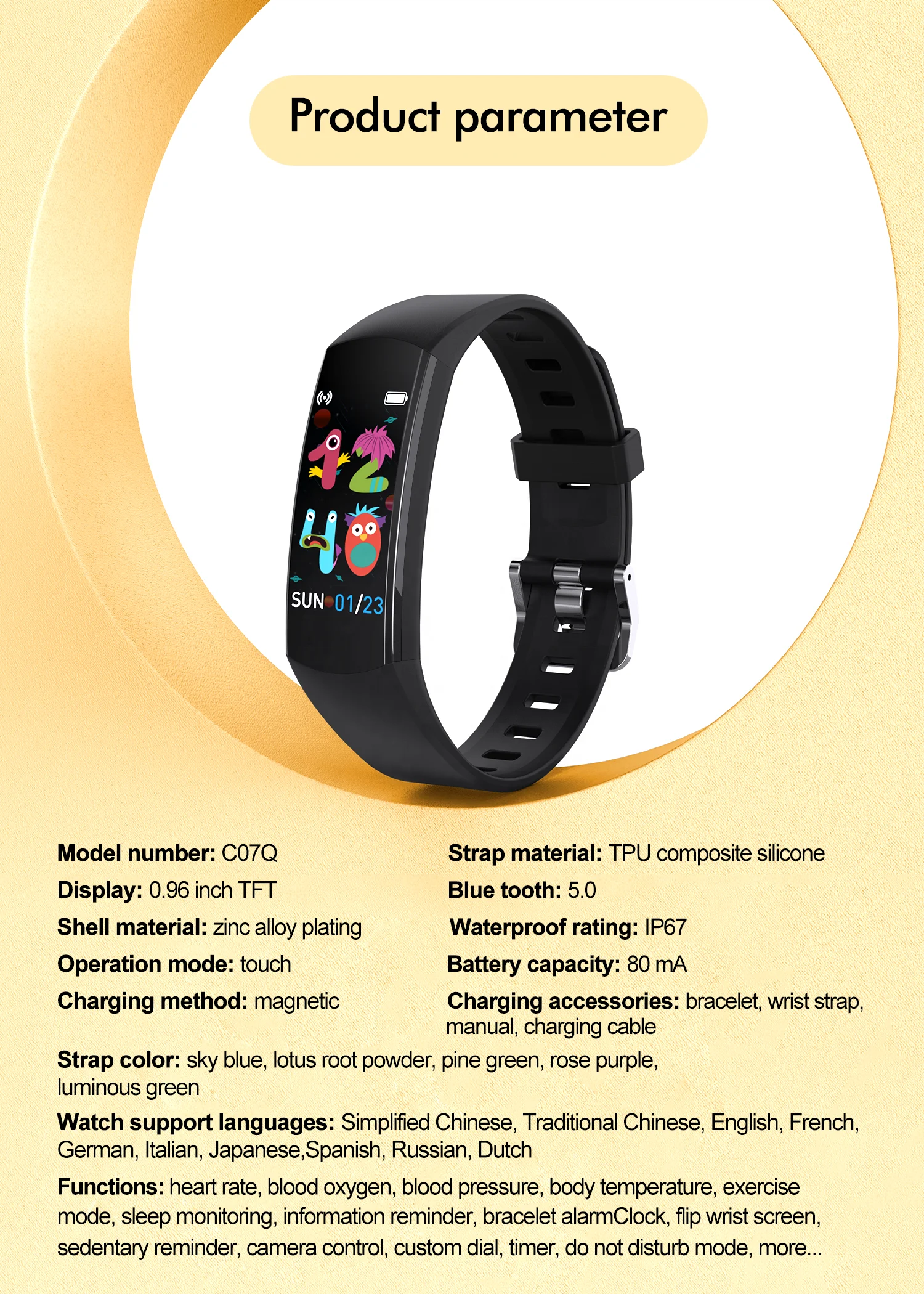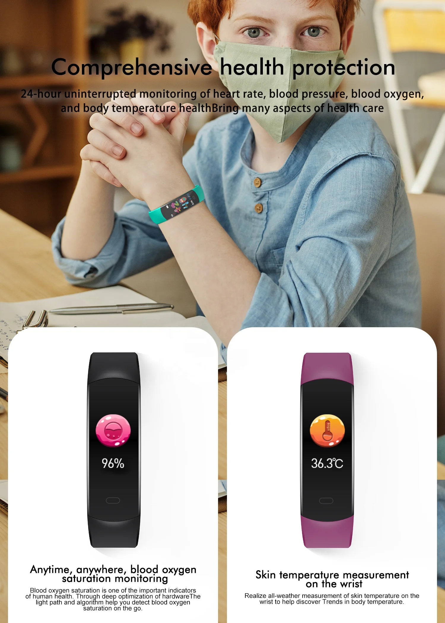 Kid’s sport smart wristband Children Wristbands Womens Watch Kids Smart Wrist Strap Touch Waterproof Sports Watch Description: Bracelet display: 0.96 inch IPS color screen, resolution 80*160 Touch mode: single touch Main control platform: TLSR8251F512ET32 version 5.0 Storage memory: RAM32KB/ROM512KB, external 32MB memory Heart rate sensor: SC7R31 Gravity sensor: SC7A20 Temperature sensor: high-precision digital temperature sensor chip CT1711 Historical data storage: 7 days Charging method: USB charging Machine size: 16.5(L)*11.7(W)*65~233(H)mm Machine weight: 20.7g Case: PC+ABS Strap: TPU Endurance: 7~10 days Standby: 50 days Waterproof rating: IP67 Battery specification: 80mA (pure cobalt polymer battery + Japanese Seiko protection board) Function push: Incoming call, SMS, QQ, WeChat, WhatsApp, Facebook, Twitter, Line, Skype, Instagram, LinkedIn, VK, Kakao Health Monitoring: Support 24 hours regular heart rate/blood pressure/oxygen/body temperature monitoring every 15 minutes Pedometer: exercise step count, calorie consumption, exercise mileage record Sleep monitoring: objectively, scientifically and quantitatively record and analyze your sleep status, automatically open from 9 o’clock every night to 11 o’clock the next morning Sports modes: walking, running, football, cycling, yoga, dancing, roller skating, badminton, tennis, basketball, mountaineering Other functions: sedentary reminder, goal achievement reminder, data sharing Google fit and Apple health, alarm clock, turn on the wrist screen, camera control, custom dial switch, timer, OTA upgrade Band language: English (default), German, French, Spanish, Japanese, Chinese, Italian, Traditional Chinese, Russian, Dutch view more >> Recommended by seller Wireless Karaoke Microphone with Controllable LED Lights Portable Handheld Karaoke Speaker Machine Christmas Birthday.