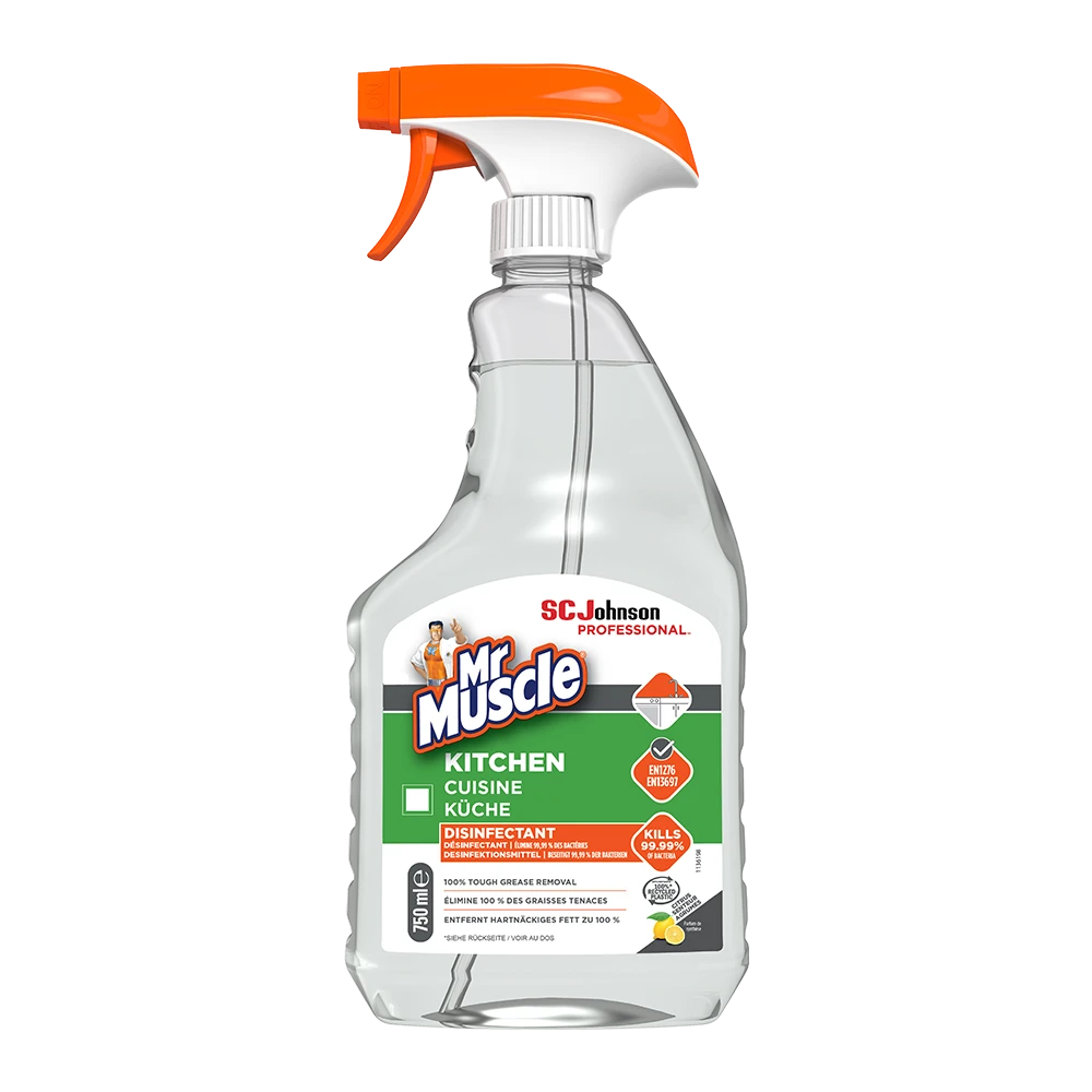Mr Muscle kitchen cleaner spray quickly cuts through dirt and grease whilst killing bacteria simply. Taint free leaving food preparation areas hygienically clean and safe. · · · Trigger spray mechanism · · Cleans fast without smearing · · Kills 99.9% of germs · · No rinsing required · · P.H Level: 12.0 – 13.0 · · Odourless · · Fully miscible in water · · Viscosity dynamic: <5 cps · · Available in boxes of 6 · · Ingredients according to EC 89/542