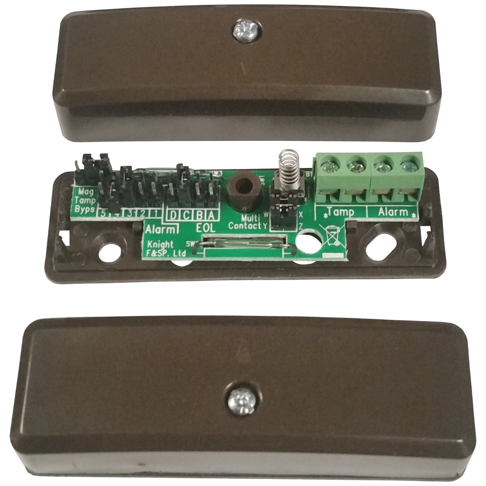 Knight Surface Contact is suitable for double doors with MID, panels. This is compatible with all mainstream UK control panels and includes both EOL and alarm by-pass resistor options. It includes resistors compatible with: Honeywell, Ademco, Orisec, Scantronic, Menvier, Texecom, Pyronix, HKC, Castle, Aritech, DSC, RISCO (Gardtec), Guardall and inner range control panels. Can be turned into a grade 2 device by simply using the header provided. · · · Double door contacts · · Can be installed on a 90 degree angle · · TACT microswitch tamper · · Just move easily accessible jumper to select · · Contains two free spacers for awkward installations