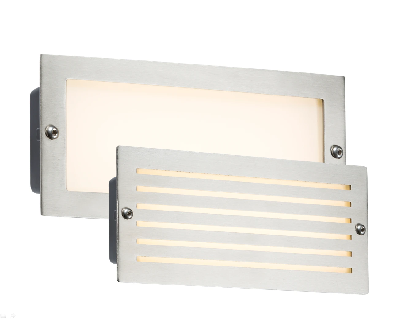 230V IP54 5W White 3500K LED Recessed Brick Light. Die-cast aluminium body, glass diffuser with Brushed Steel fascia. Supplied with a choice of 2 face plates – Plain and Grill. Bezel made of 201 stainless steel. · · · IP54 5W White LED Recessed Brick Light