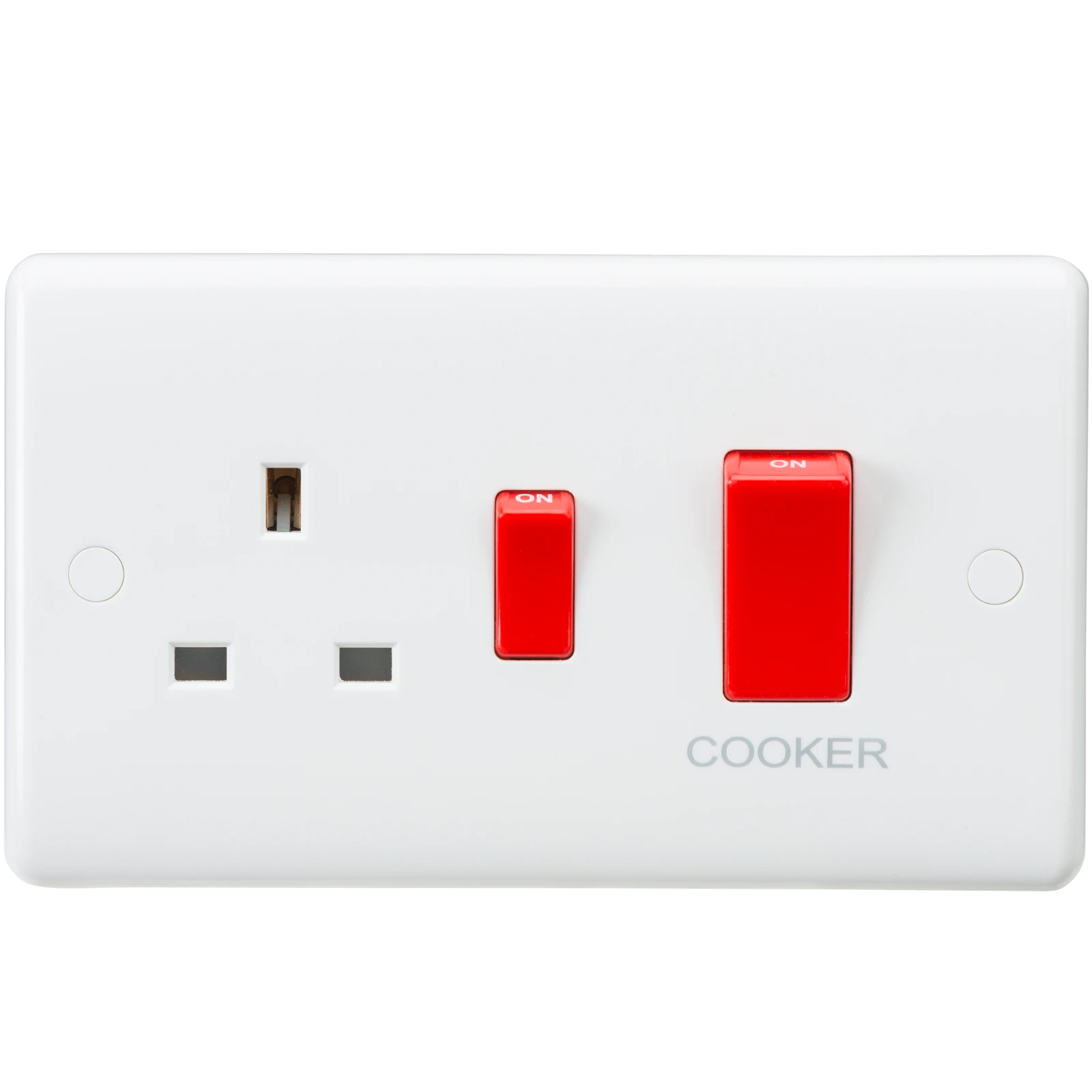 Gently contoured 7mm plate with rounded edges and anti-microbial properties · · · 45A DP Cooker Switch · · 13A Switched Socket · · Laser printed for cleaner look and longevity · · Includes screw cap covers · · Certified to BS 4177, BS 1363-2 · · Supplied in Knightsbridge rip top polybag with euro slot