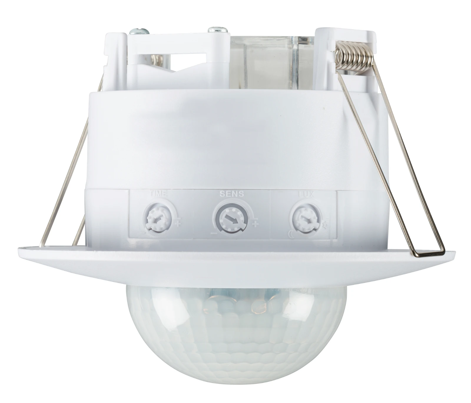 Wide range PIR ceiling sensor · · · IP2 rated for indoor use only · · Recess fitting · · Cut out: 8mm · · 36° field of detection · · 2-2m range · · Adjustable Lux · · Adjustable time: Approx. 1 seconds to 1 minutes · · Can be wired in parrallel · · Switching capacity: Max. 2W Incandescent / Max. 1W LED · · Certified to EN 5515, EN 61547, EN 61, LVD Directive