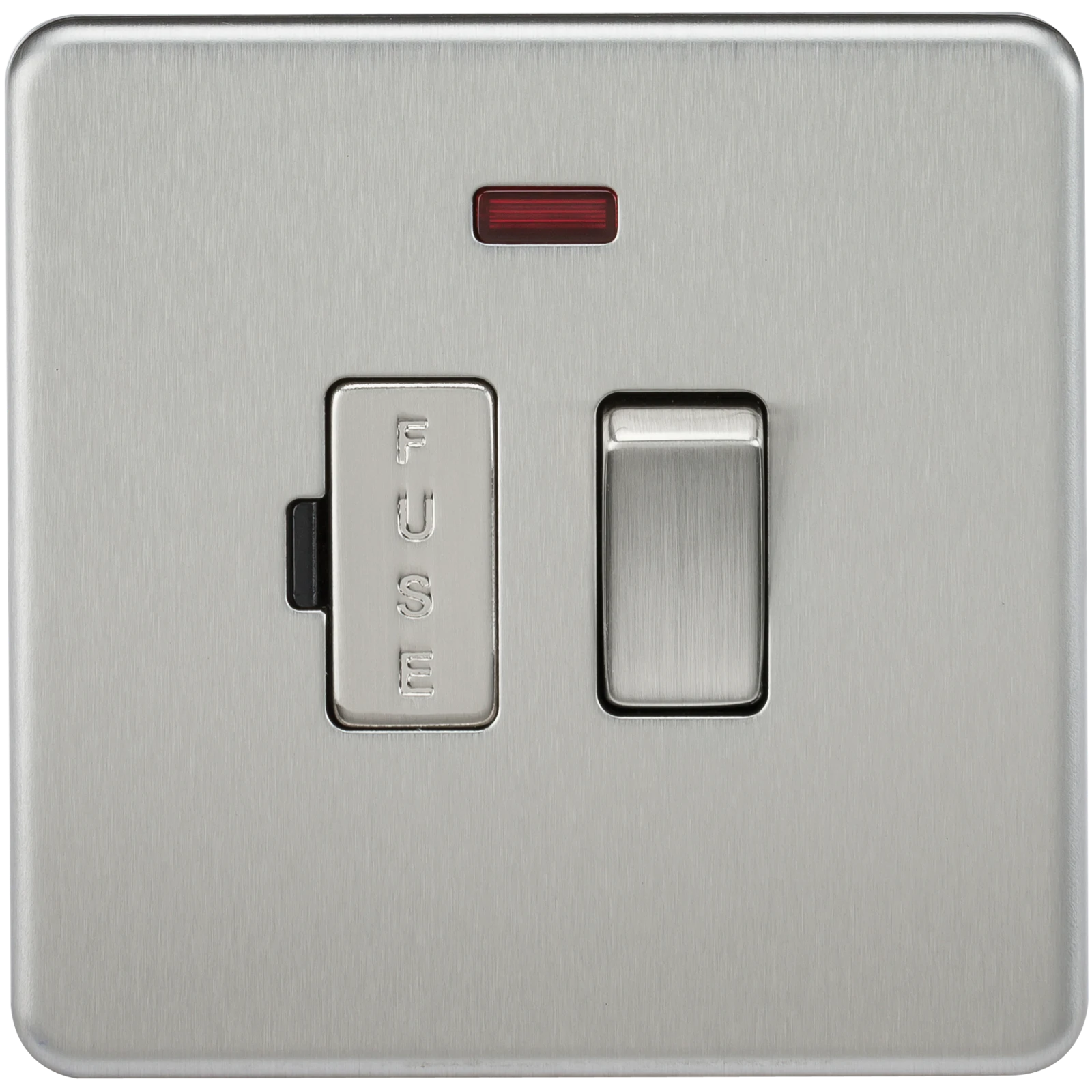 Fused spur solution in flawless Screwless low profile metal design with matching fuse holder and rocker · · · 13A rated · · Switched · · With neon indicator · · Screwless low profile design with built in gasket · · Certified to BS 1363-4 · · Minimum mounting box depth 25mm