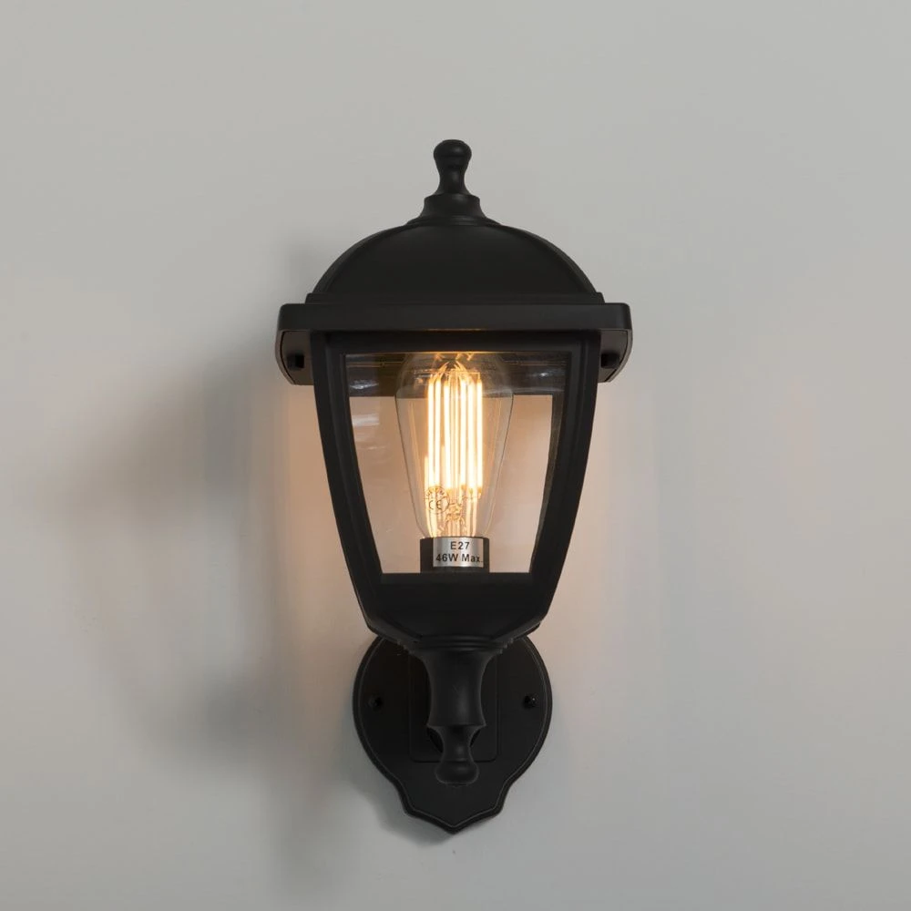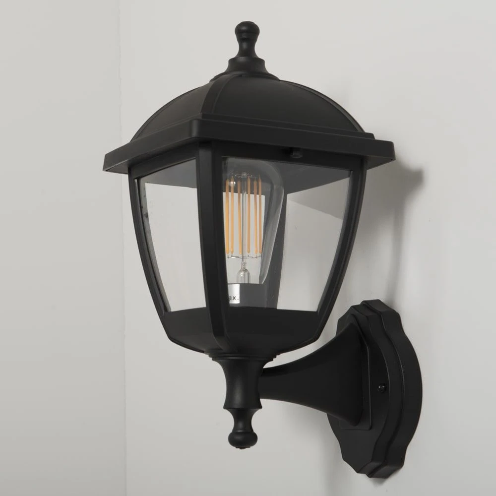 A stylish traditional lantern that has a 4 sided shape for a more modern look. · · · Body colour: Black · · Non dimmable · · E27 – 46W Max · · IP44 · · Material: Polypropylene (body) – Polycarbonate (diffuser) · · PIR: No · · Material: Polypropylene (body) – Polycarbonate (diffuser) · · Class II · · 1yr Warranty