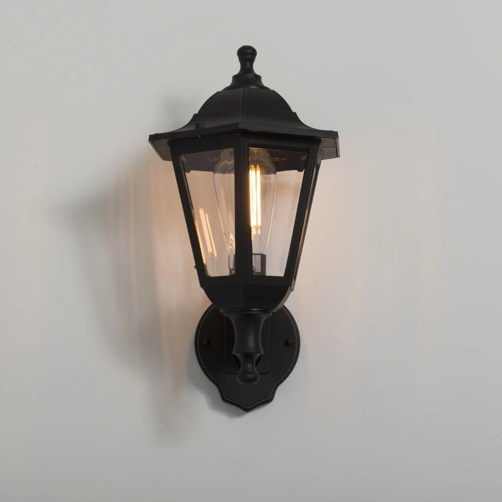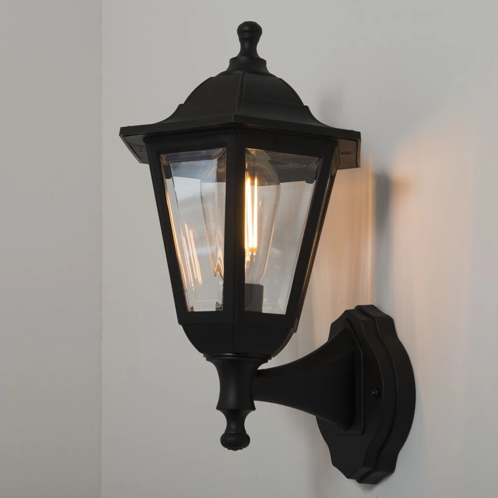 A stylish traditional lantern that has a 6 sided shape for a more modern look. · · · Body colour: Black · · Non dimmable · · E27 – 46W Max · · IP44 · · Material: Polypropylene (body) – Polycarbonate (diffuser) · · PIR: No · · Material: Polypropylene (body) – Polycarbonate (diffuser) · · Class II · · 1yr Warranty