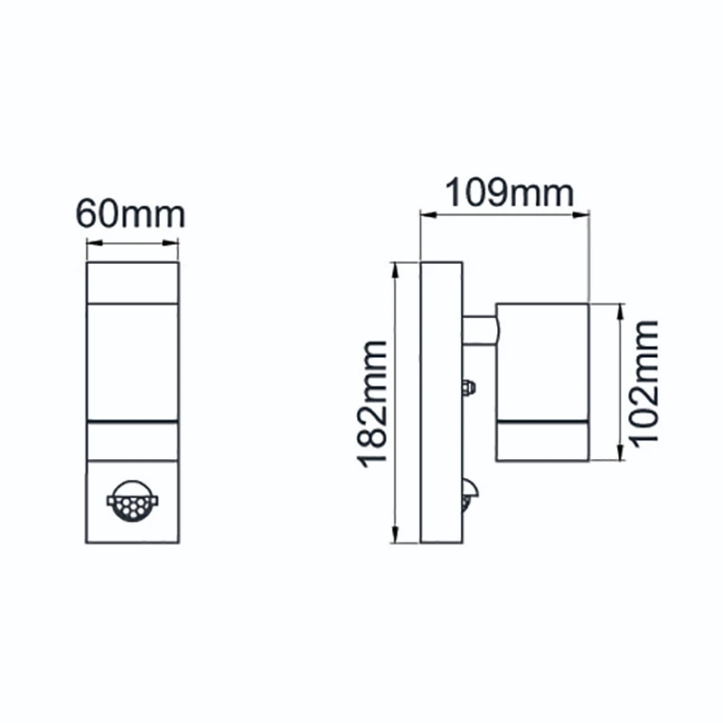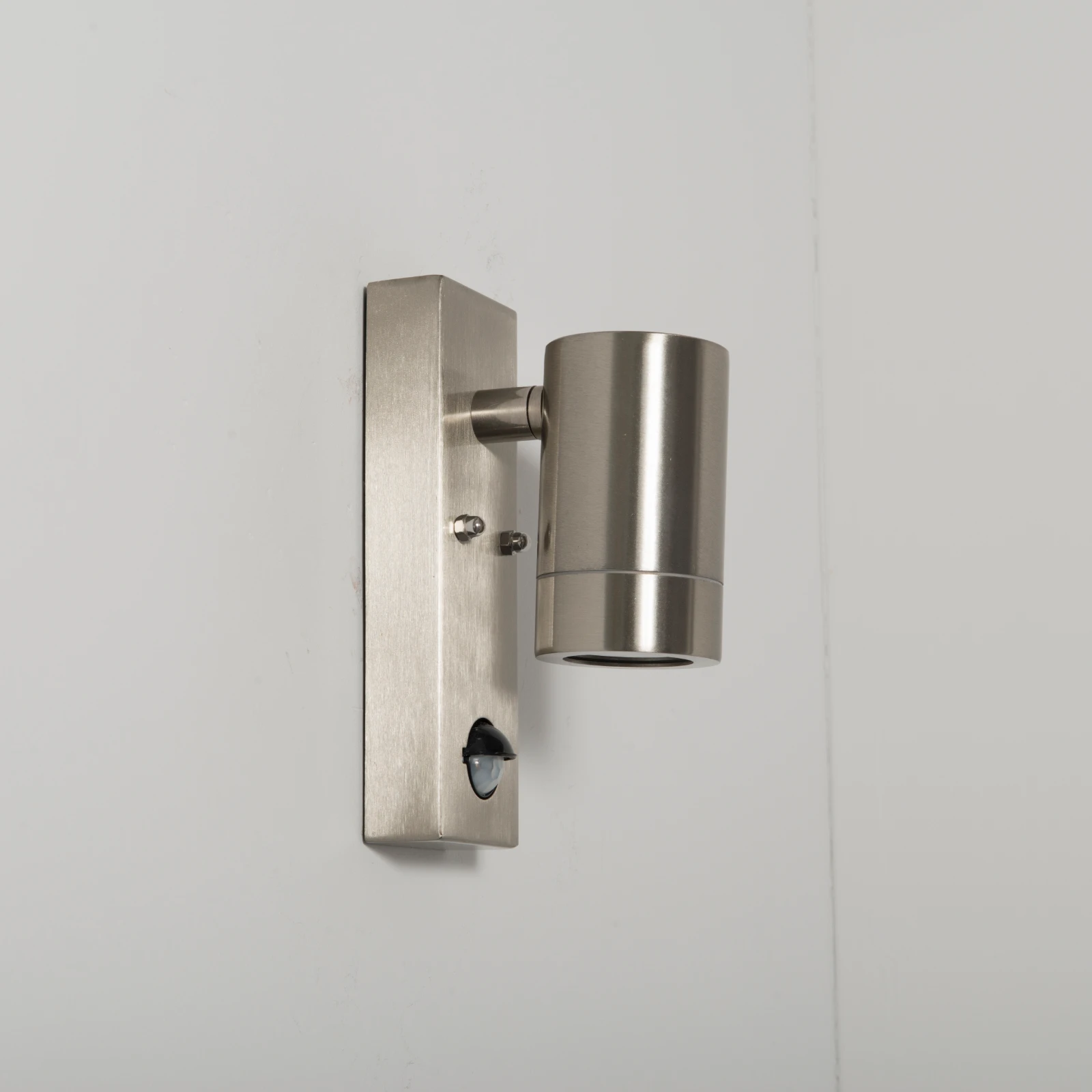 TULUA III 35W GU10 PIR Stainless Steel Up or Down Single Wall Light · · · GU10 35W Max · · Suitable for GU10 LED Retro Fit Lamps · · Not suitable for high saline areas · · Product supplied less lamp · · IP44 · · Warranty: 1 Year · · Switch Time: 12 seconds to 4 minutes · · Range: 9M when mounted at 4M