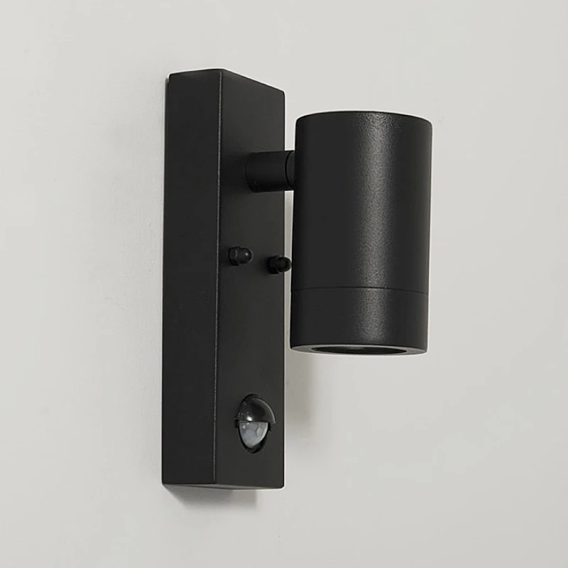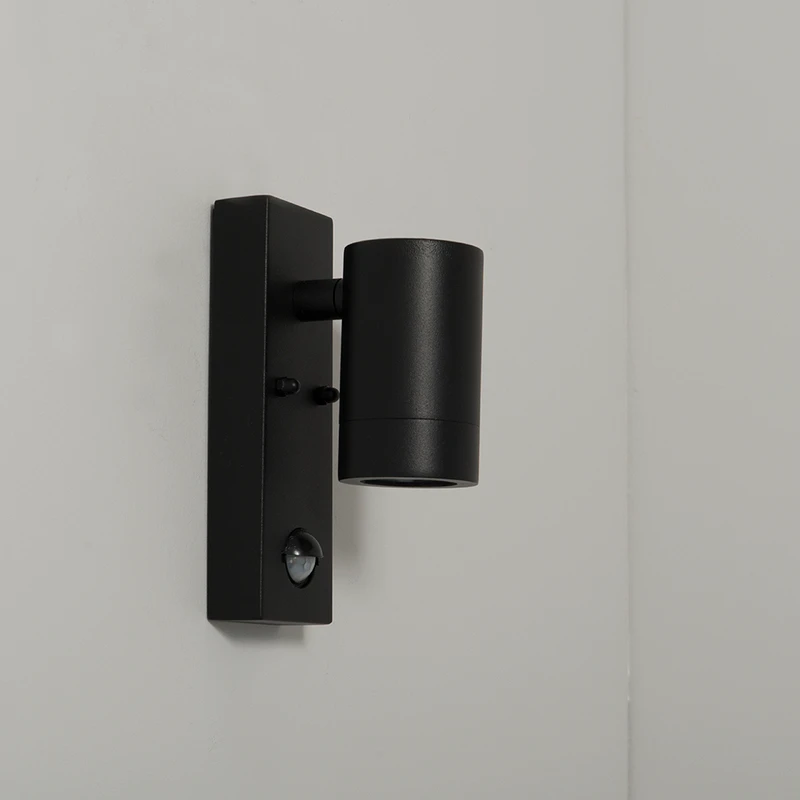 GU10 PIR Single Wall Light Black · · · GU10 · · 35W Max · · PIR settings: 12 seconds to 4 minutes · · Suitable for GU10 LED Retrofit Lamps · · IP44 · · Suitable for Low energy GU10 LED Energy saving lamps · · Black · · Aluminium body · · Glass lens