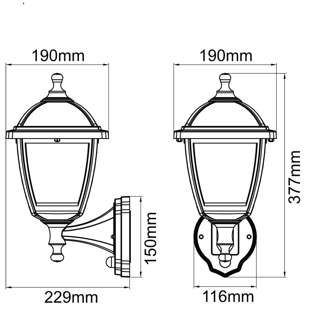 The Bastia range of LED lanterns consisting of 4 lanterns. 2 four sided lanterns and 2 six sided lanterns both with or without PIR sensor. The non PIR versions can be constructed as either upward or downward lanterns. The PIR versions can only be mounted as upward lanterns. Suitable for use in high saline coastal areas. Integral driver and 3000K 8W LED. Complete with 2 year warranty · · · IP44 · · Class II · · 8W 3000K LED · · Suitable for High Saline areas · · 4 sided or 6 sided options · · 220-240v · · Non PIR versions can be constructed to be either an upward or downward lantern · · Non Dimmable · · 419 Lumens