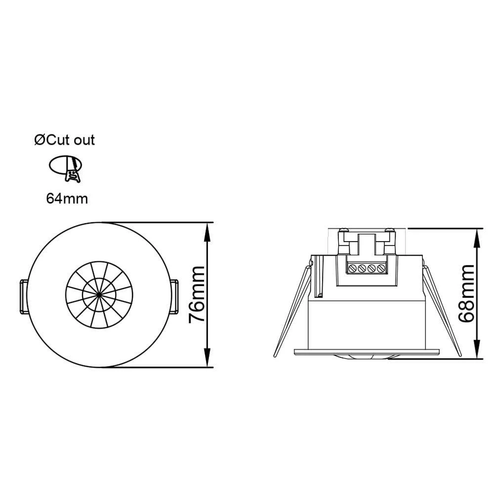 Recessed mounted internal PIR Sensor · · · Detection range: 6m · · Mounting height: 2~2.4m · · Detection angle: 360° · · Detection speed: 0.6~1.5m/Sec · · Time Settings: 10 seconds ~ 15 minutes · · Warranty: 3 Years · · Maximum LED switching: 300W · · Maximum Halogen switching: 1200W · · Maximum Fluorescent switching: 300W · · IP55