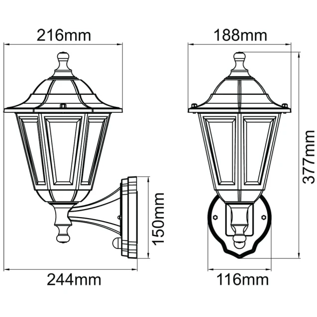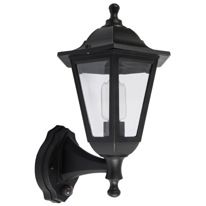 A stylish traditional lantern that has a 6 sided shape for a more modern look. · · · E27 – 46W Max · · Lamp not included · · Supplied with PIR · · IP44 · · Material: Polypropylene (body) – Polycarbonate (diffuser) · · Detection Range: 1-8m (when mounted at 2m) · · Detection Range: 1-8m (when mounted at 2m) · · Class II · · 1yr Warranty · · Warranty: 1 Years